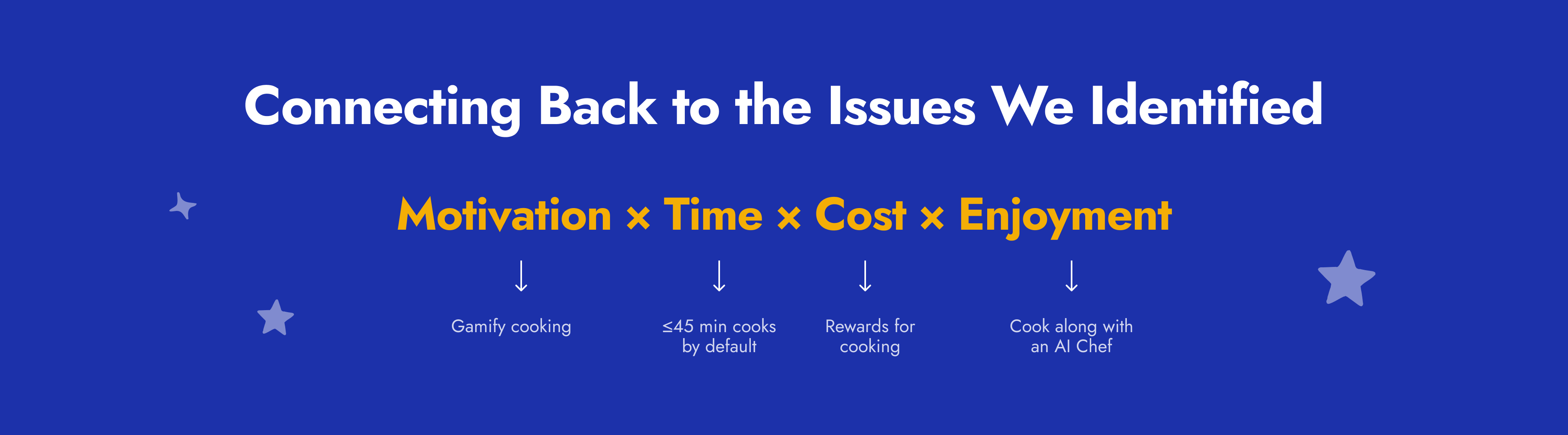 let’s go back to this equation—motivation × time × cost × enjoyment and let's go back to our user, laura. how might we make cooking quick, fun, and doable as part of a routine? we believe that by gamifying cooking, this could give laura the ability to have more fun in her already packed schedule. by keeping our recipes to be 45 minutes or less to make, laura is given the opportunity to use her time more efficiently.