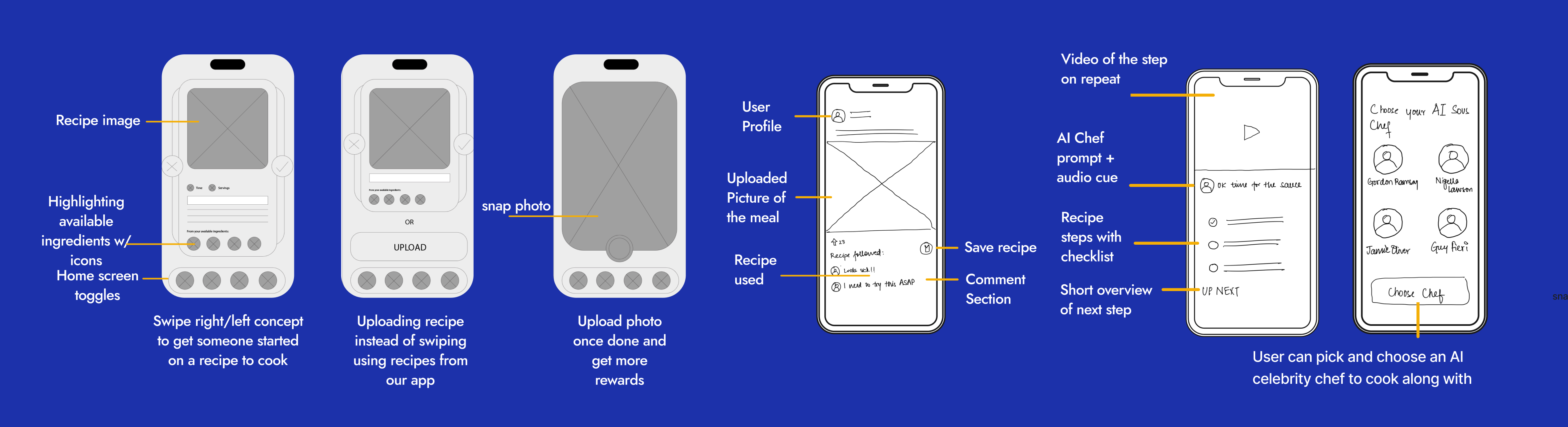 we started to visualize how this could look by sketching some ideas. what if we have a tinder like function where you can swipe on recipes so you can get matched to a recipe that’s fit for you? how does the app determine if you cooked the meal? perhaps by uploading a photo? what could social media look like on this app? how could we include videos and ai chefs into this experience so that the recipe is easy to follow? how are we going to include monetization into this experience? eventually, this kept evolving.