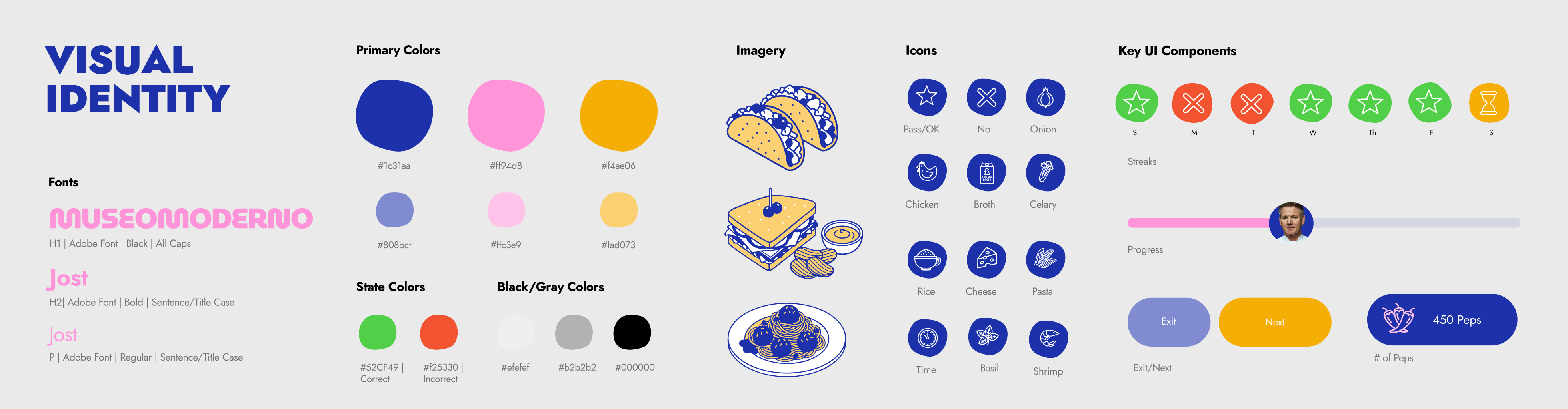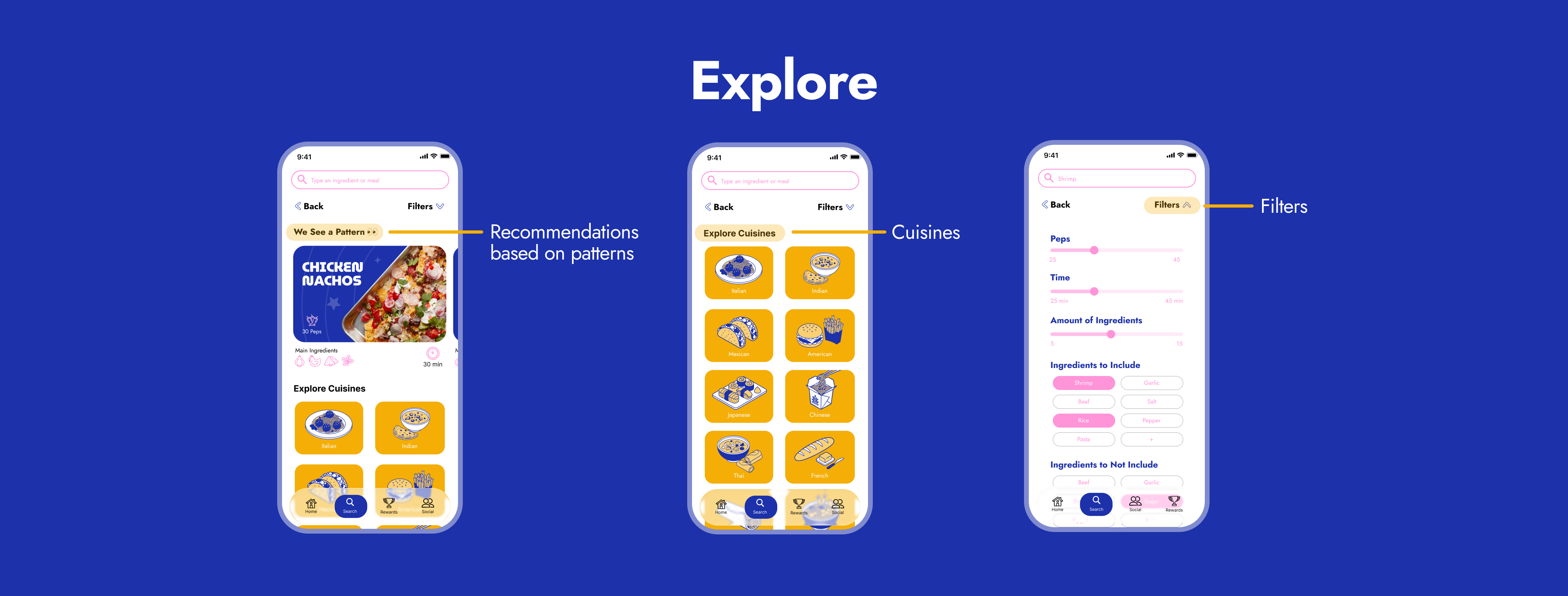 as our sketches were evolving, it became clear that our app would and should be a fun one—and we needed color, typography and illustrations to support that. we wanted to emote motivation, excitement, playfulness and inspiration. we did that by going with a typeface that is fun. we chose this blue, pink and yellow palette because of its bold nature. the unpolished look of our imagery and illustrations invite our users to be messy with their cooking experience and to ultimately have fun.
