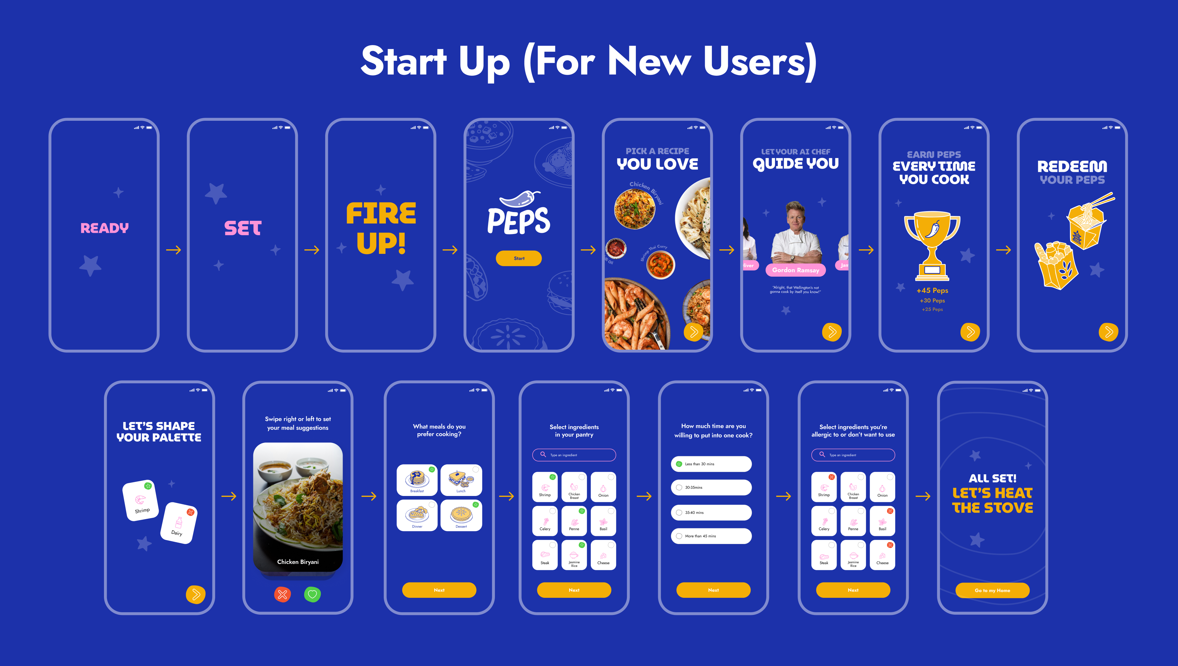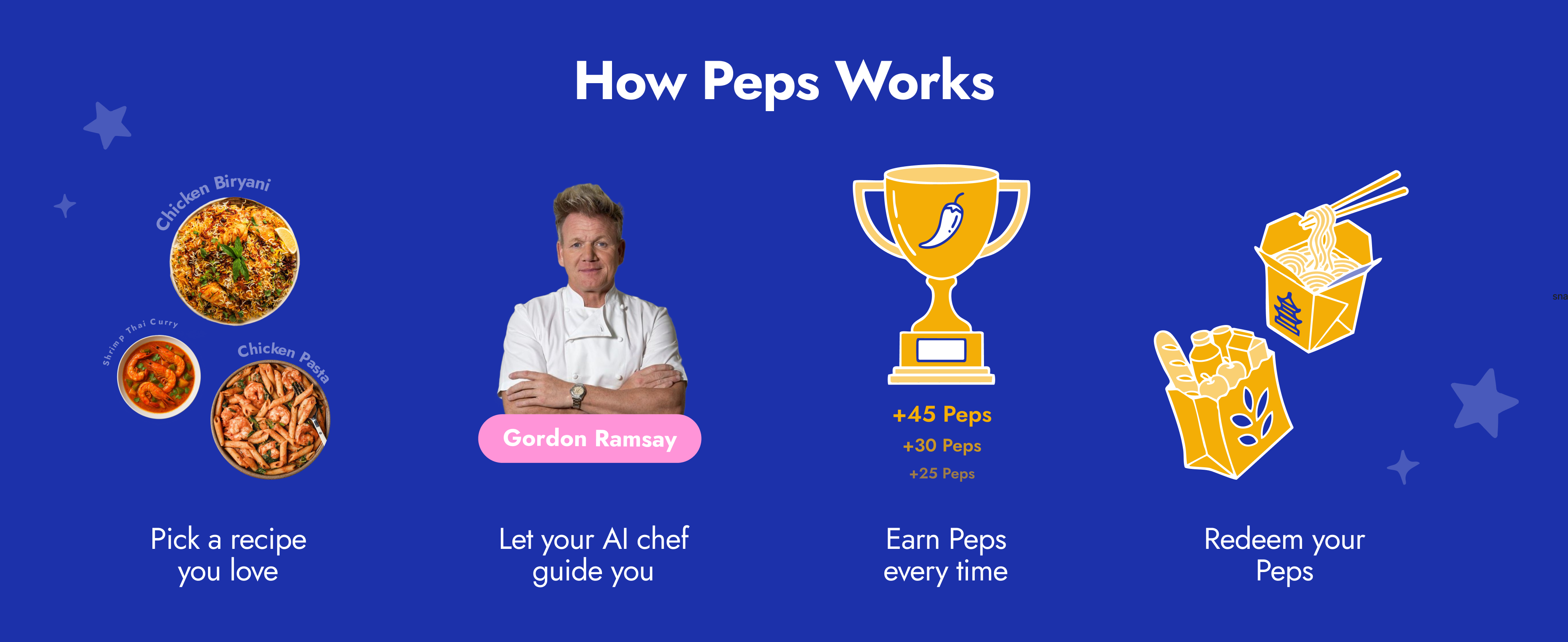 what exactly is a “pep”? pep is a word that represents energy, liveliness, and motivation — like having pep in your step. that’s exactly the feeling we wanted to bring into cooking. it also subtly promotes a sense of urgency and momentum, encouraging users to keep moving and stay engaged. and finally, it’s a playful nod to peppers — something flavorful and central to cooking, just like the recipes in the app. naturally we chose peps as a currency for this app. every cooking minute is equal to 1 pep. and you can exchange 100 peps fo $5 grocery/takeout credit.