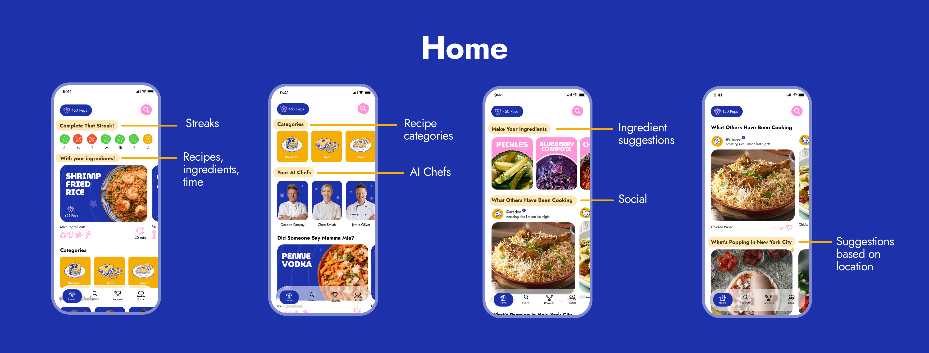 our homescreen shows our users how many peps they have, their progress with streaks, view suggested recipes, available ai chefs, suggested recipes, a sneak peak at social and recipes that’s trending in your area.
