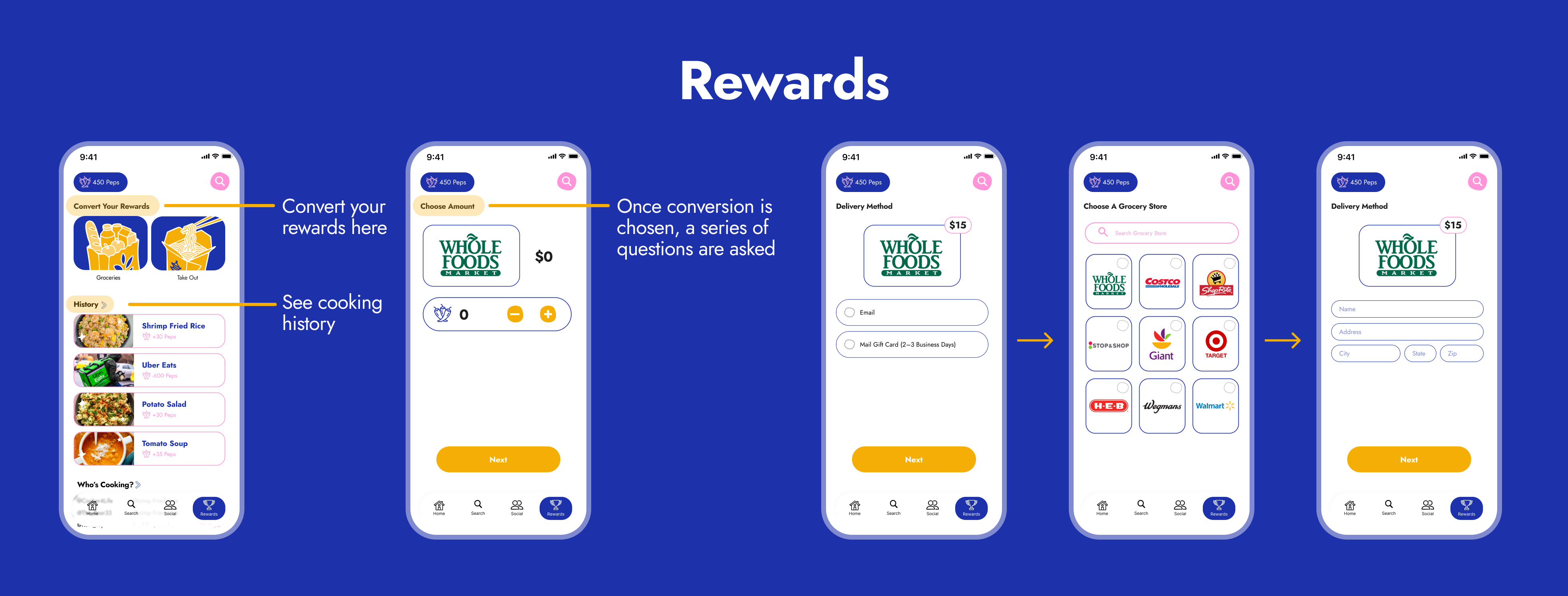 once it’s time to exchange your peps, there’s a rewards page. this dashboard gives you access to rewards history to see and recipes made and any exchanges made. you can also redeem peps for groceries and takeout. because you get $5 for every 100 peps, you can redeem in 100 pep increments. you’re also given the opportunity to get it in a gift card or via email.