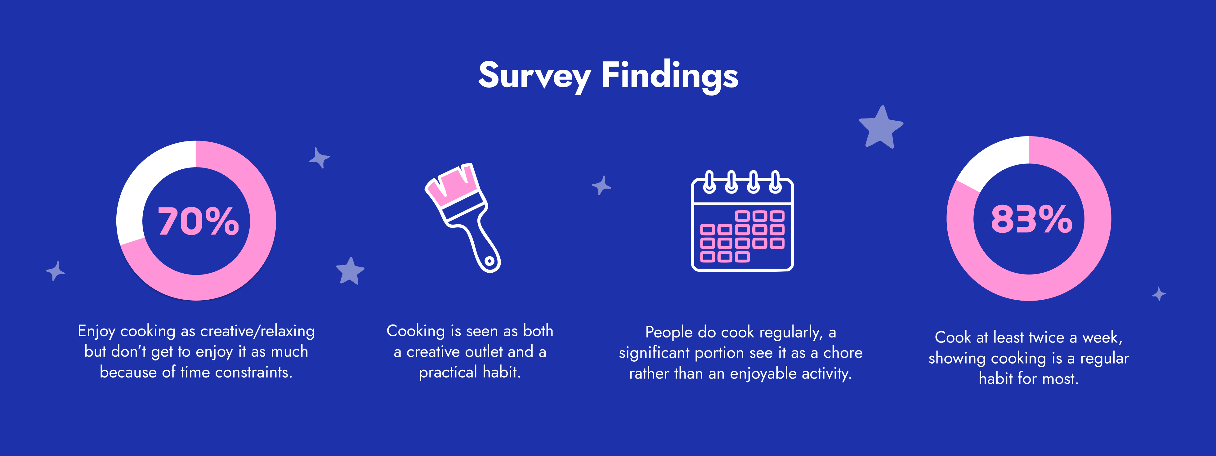 in addition, our survey results reinforce what we heard in interviews — people do like cooking, but time constraints and the mental load make it feel like a chore. cooking holds a dual role in people’s lives — it’s both a creative outlet and a practical necessity. in addition, cost holds weight in a person's cooking decision. the gap lies in how to make everyday cooking feel less like a chore and more like the enjoyable part.