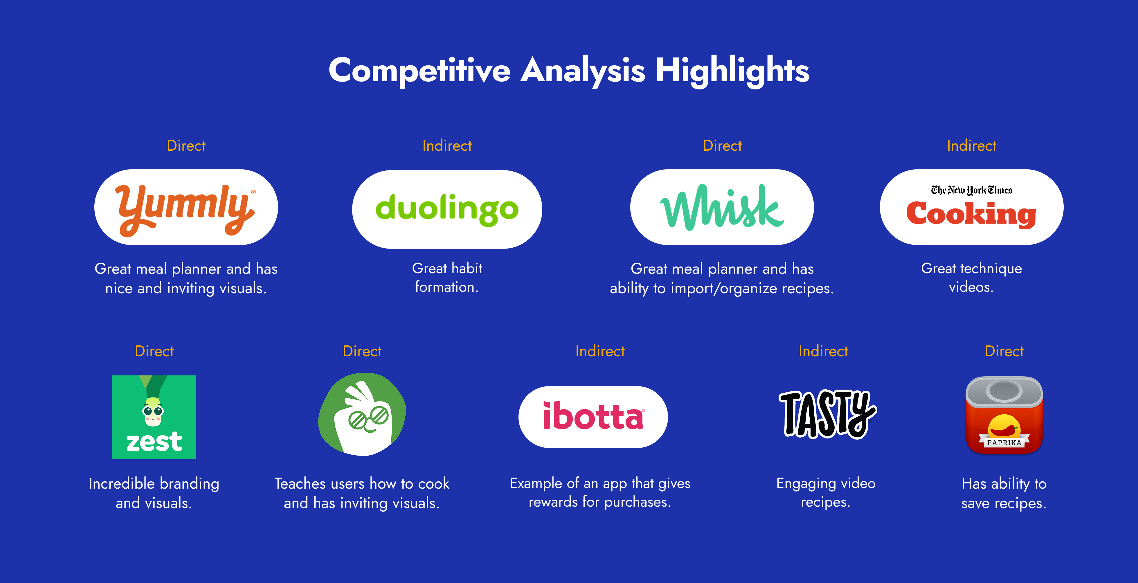 while each app has its strengths, none of our interviewees reported using them—except for one who had tried zest. among all competitors, zest stood out as the most playful in both its ui and its educational, game-like format. almost like a combination of a recipe app and duolingo. this insight pointed us toward a clear direction: designing at the intersection of motivation, time, cost, and enjoyment.