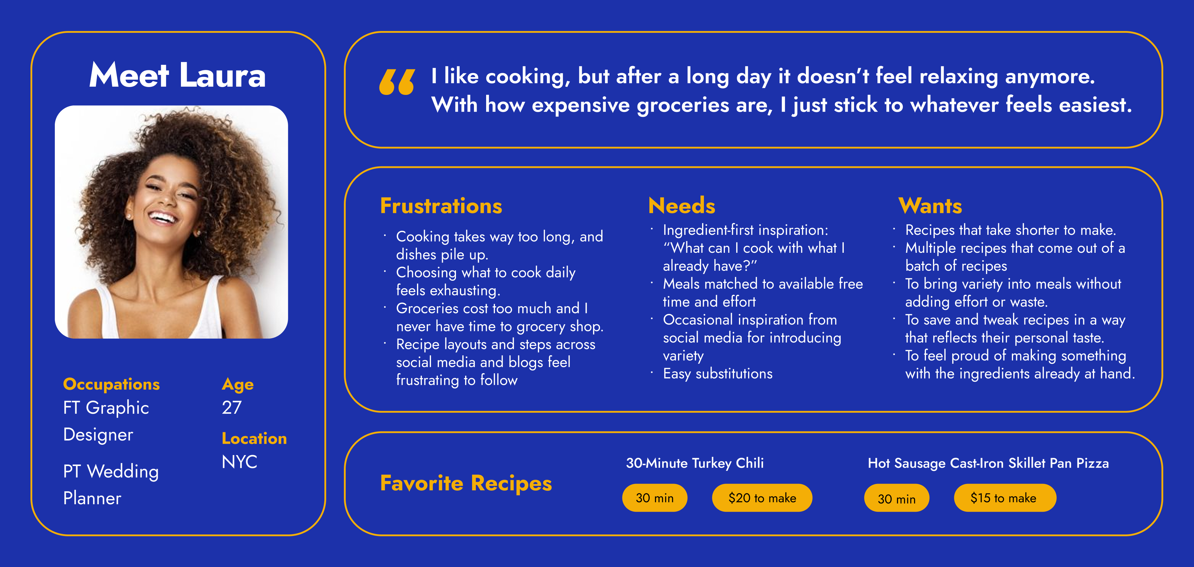 this is laura, our primary user. laura is in her late 20s, juggling multiple jobs with an active social life. weekdays are a blur of work, commuting, and trying to squeeze in errands or a quick workout. by the time she gets home, cooking feels like a chore rather than a pleasure. they enjoy cooking when they can — it feels grounding, healthier, and more affordable than eating out — but the reality of long workdays, groceries, and cleanup often makes it hard to keep consistent. they’re always looking for ways to simplify daily routines and carve out more balance between their personal well-being and professional responsibilities. laura helped us focus on a key insight: people don’t dislike cooking — life has made it feel like work.